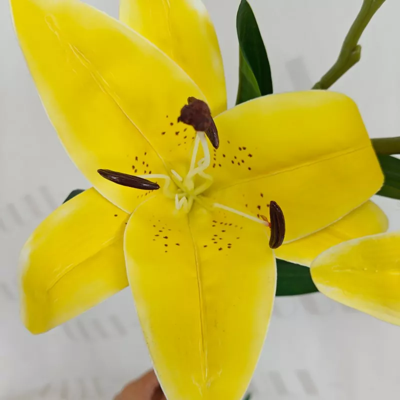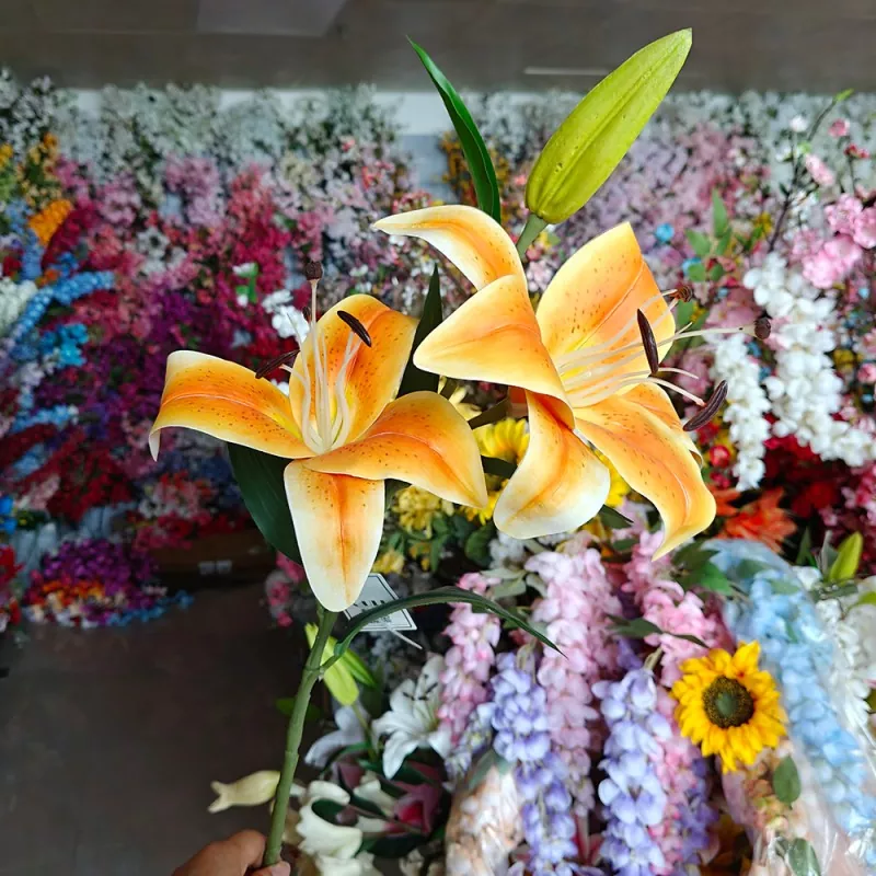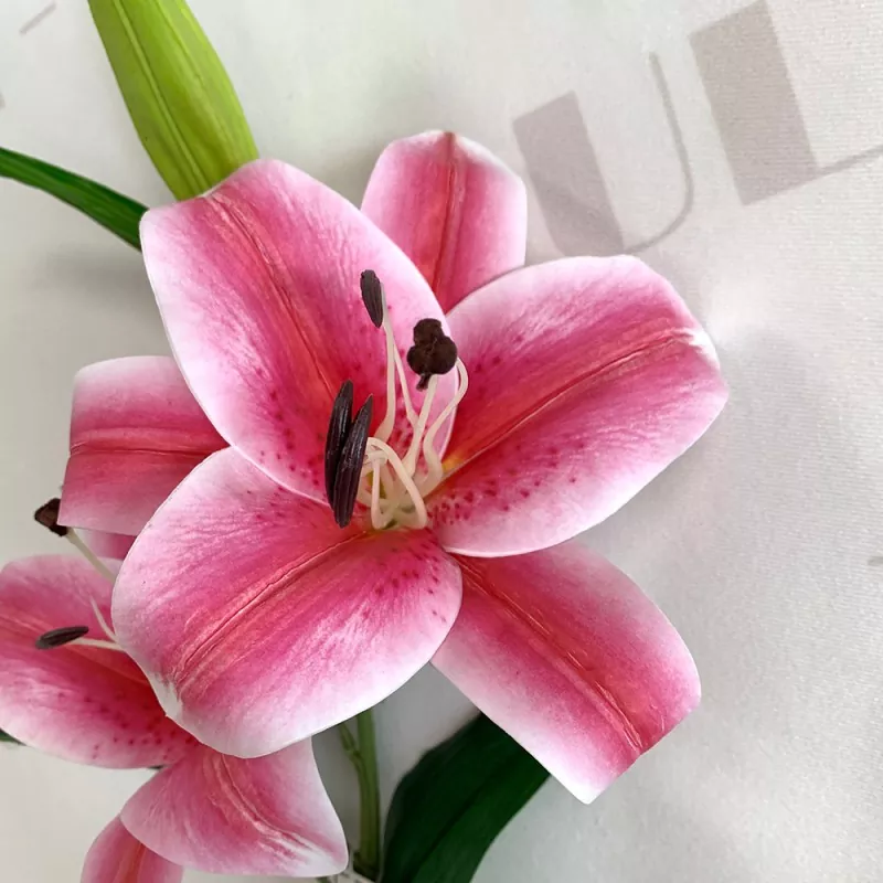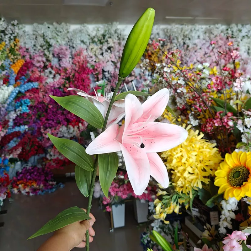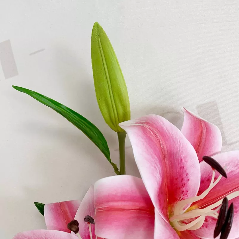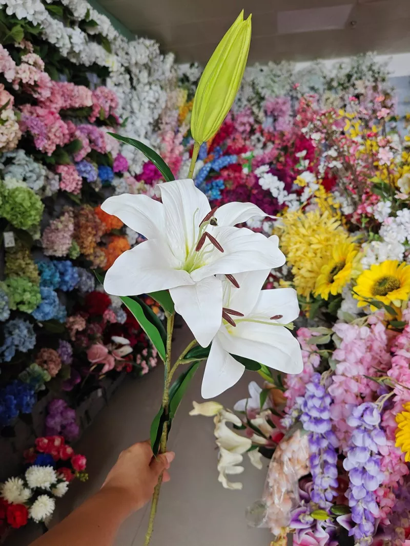 Agus bláthanna saorga á roghnú le haghaidh socruithe bainise, tá níos mó agus níos mó lánúineacha ag tosú ar Lily falsa PU, atá an -réadúil agus nua -aimseartha. I gcomparáid le bláthanna plaisteacha traidisiúnta, tá PU bog agus nádúrtha, agus mothaíonn sé cosúil le peitil réadacha, atá an-oiriúnach do lile saorga le haghaidh áirse bainise, lárphointí boird, nó cúlra bláth nua-aimseartha agus radhairc ardéilimh eile.